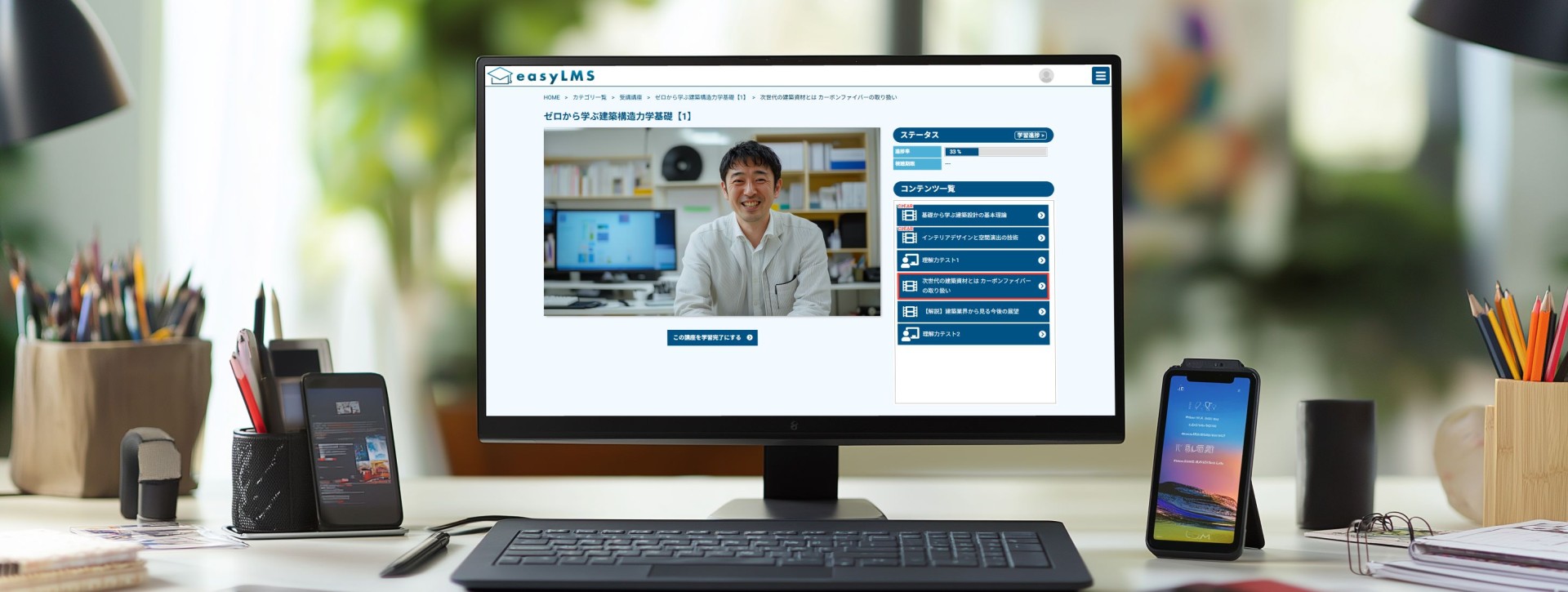easyLMSは、パソコン、スマートフォン、タブレットなど、さまざまなデバイスに対応した学習管理システム(LMS)です。場所や時間を選ばず、効率的に学べる環境を提供します。映像や音声、テスト作成、電子書籍まで、多彩なコンテンツを自由に組み合わせて、最適な学習体験をデザインしましょう。